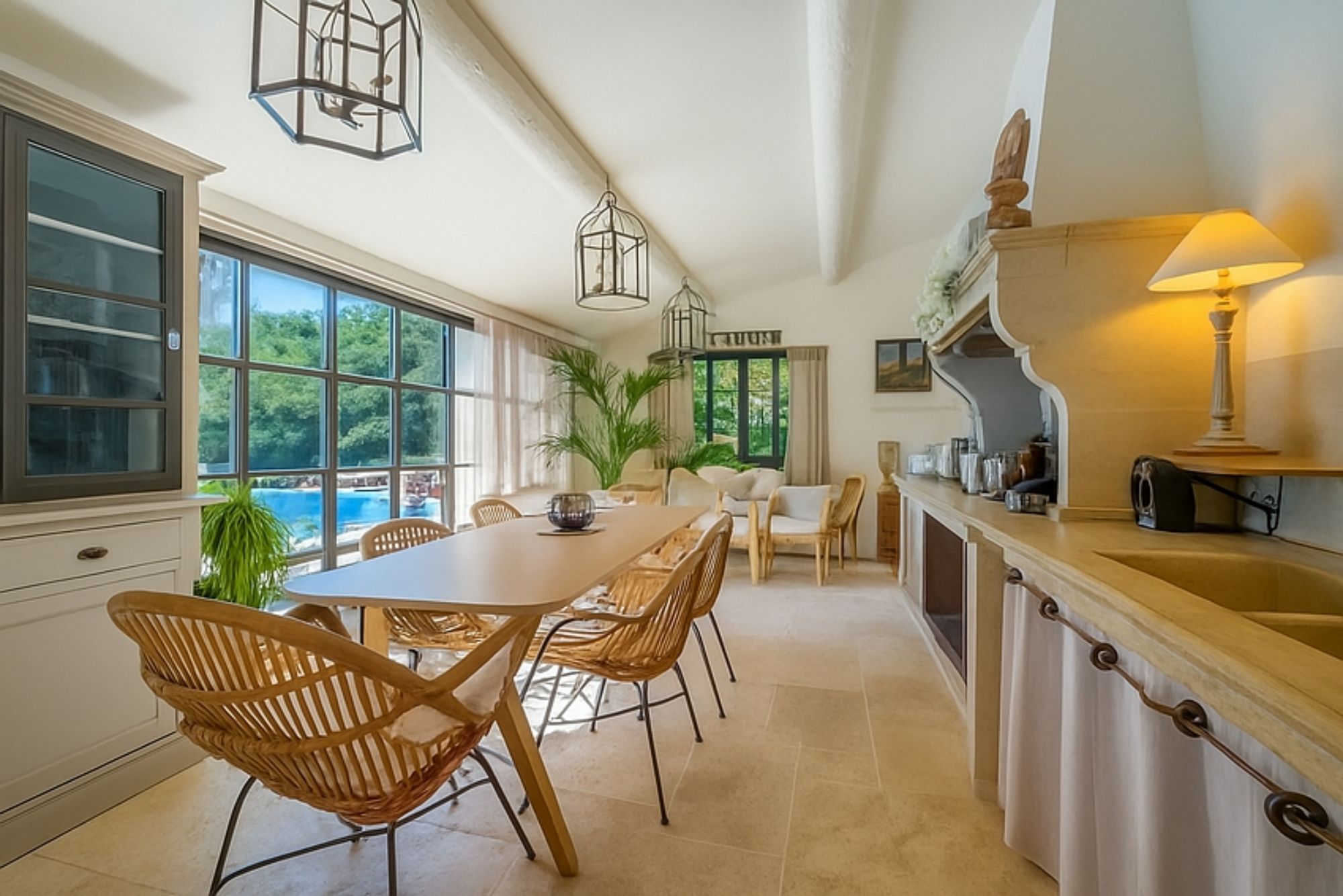 La magnifique cuisine d’été, avec cheminée ouverte et espace repas, donne directement sur la piscine et les terrasses. Elle invite à des moments de partage inoubliables, en toute saison, dans une atmosphère paisible et authentique.